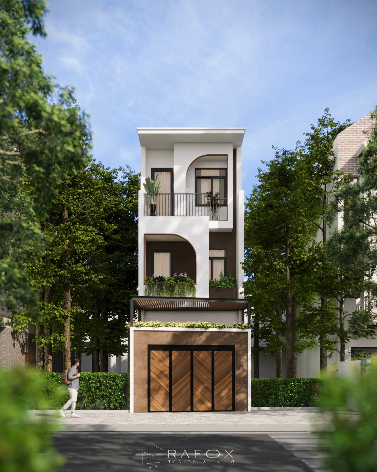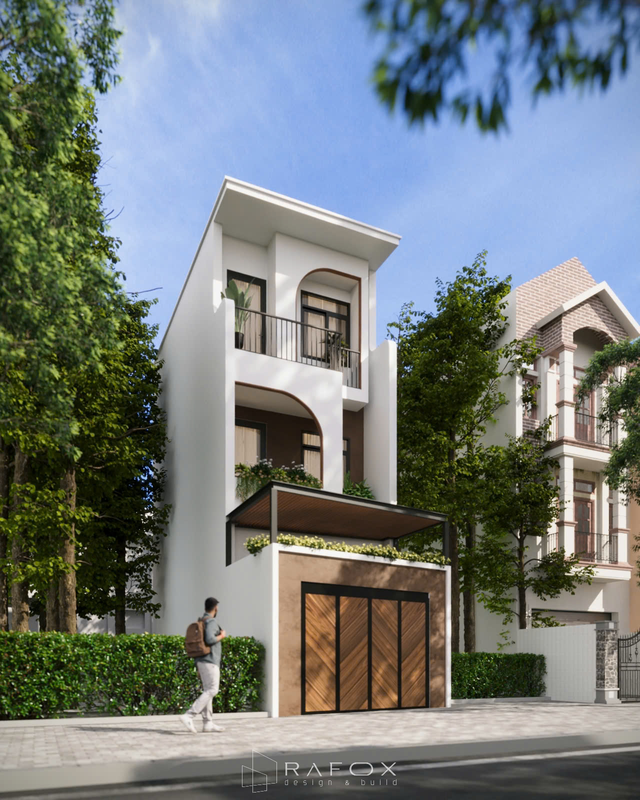 - Hình khối và đường nét: Ngôi nhà sử dụng hình khối tối giản, gọn gàng nhưng lại kết hợp thêm các chi tiết phá cách như đường cong (vòm cửa) và ban công bo tròn. Đây là một trong những đặc trưng của phong cách Đương đại, đó là sự pha trộn giữa các hình khối truyền thống và các yếu tố linh hoạt, mềm mại.